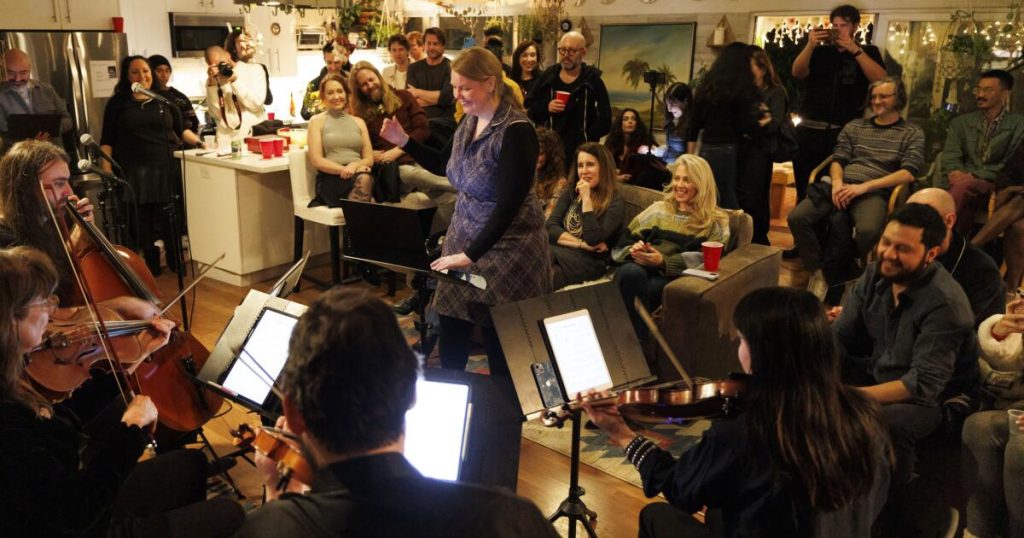 In the living room, the string quartet tuned and sawed to life as hosts Carisa Bianca Mellado and Andrew Dalziell laid out the night’s program: four L.A. film composers leading sets of new piano and string pieces. As the 30 or so guests took in the work — haunting choral runs, minimalist chamber suites and sacred-music melodies — you could hear the grit and intimacy of players figuring out their scores right in front of you.