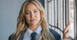 Kate Hudson is sitting on a folding chair in a crowded storage closet when suddenly the voice of Kate Hudson comes booming through the wall.