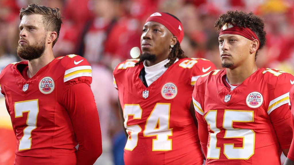 Chiefs, from left, Harrison Butker, Wanya Morris and Patrick Mahomes listen to the national anthem before playing the Baltimore Ravens at GEHA Field at Arrowhead Stadium on Sept. 5, 2024, in Kansas City. (Christian Petersen/Getty Images)