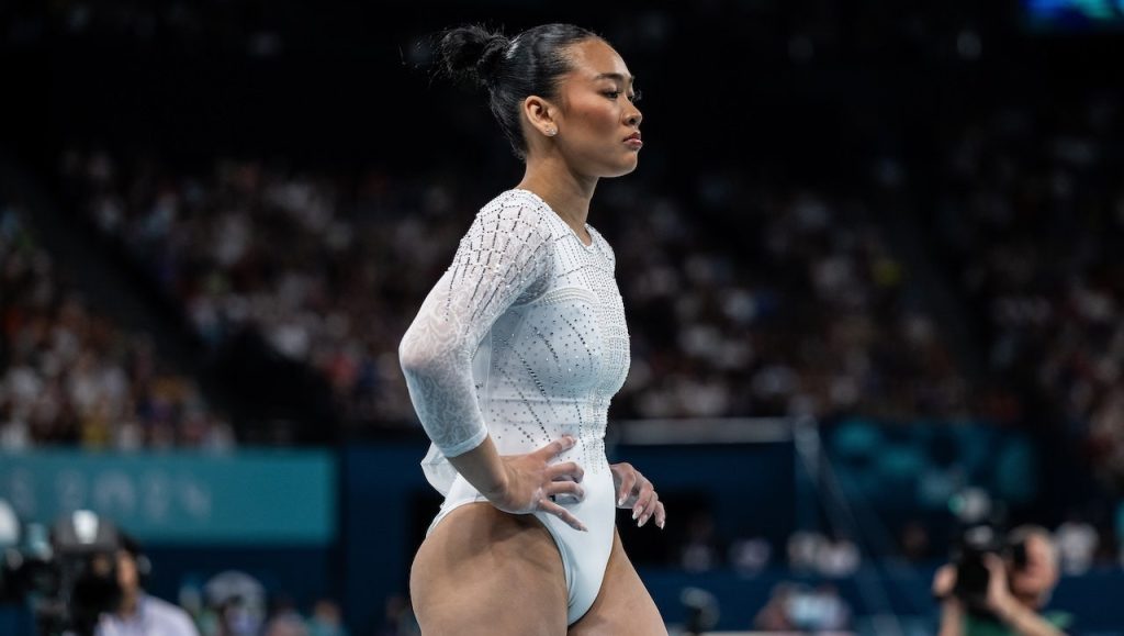 Sunisa Lee after failing on women’s balance beam on day 10 of the Olympic Games Paris 2024 at Bercy Arena on August 5, 2024 in Paris, France. ( Markus Gilliar – GES Sportfoto/Getty Images)