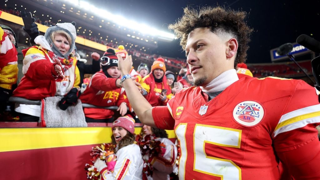 Patrick Mahomes of the Kansas City Chiefs celebrates with fans after defeating the Houston Texans in an AFC divisional playoff game at GEHA Field at Arrowhead Stadium Jan. 18, 2025, in Kansas City, Mo. (Jamie Squire/Getty Images)