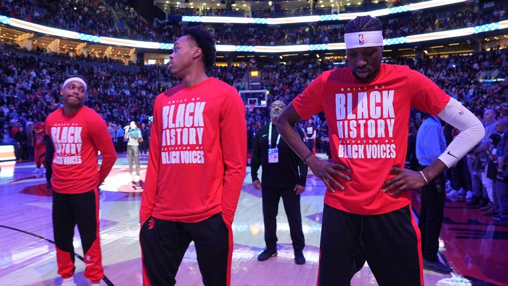Raptors forwards, from left, Bruce Brown, Scottie Barnes and Chris Boucher react as fans boo the U.S. national anthem before the Los Angeles Clippers game in Toronto, Sunday, Feb. 2, 2025. (Frank Gunn/The Canadian Press via AP)