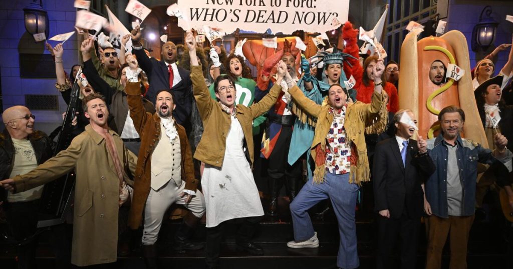 The special’s sketch paying tribute to New York through the years initially seemed like an unlikely premise for humor. The beginning started with John Mulaney as a hot dog vendor educating two out-of-towners (David Spade and Pete Davidson) who want to make it in the Big Apple. But the funny kicked up a notch when Adam Driver in a hot dog costume and Maya Rudolph as a needle of heroin launched into a send-up of “Fame.” The Broadway musical parodies continued, ranging from “Les Misérables” and “Little Shop of Horrors” (Scarlett Johansson showing some impressive singing chops as a battered Audrey) to Lin-Manuel Miranda and McKinnon as disgraced New York Mayor Rudy Giuliani riffing on “Hamilton.”