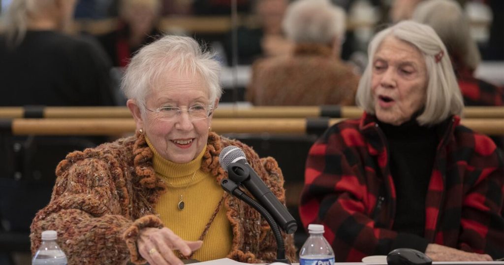 Victoria Bullock, right, a volunteer who wields a gavel and words of encouragement listens with J. Rickley Dumm, 84, left.